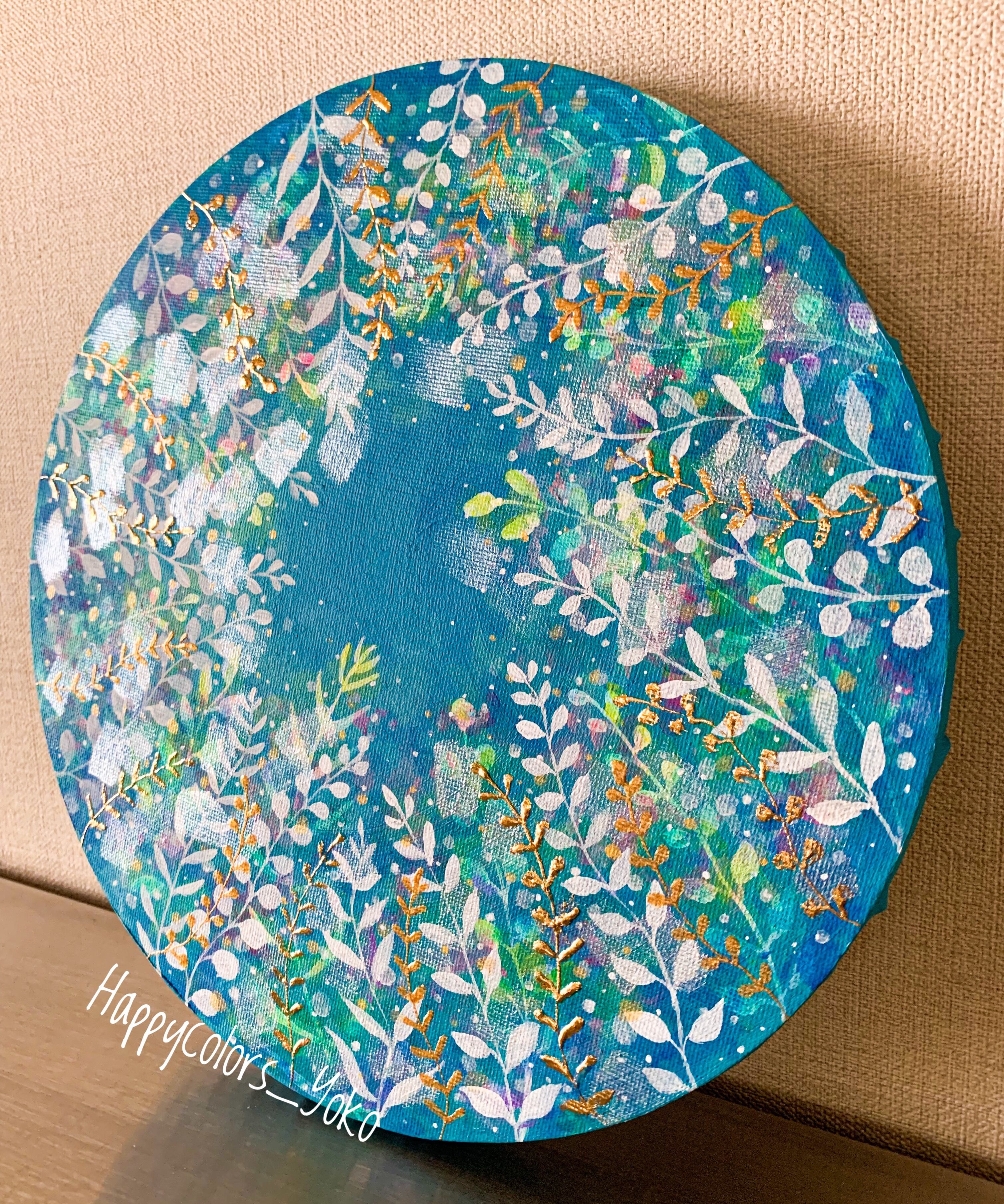 葉っぱに囲まれて、大きく深呼吸したくなるような絵を描きました。 丸キャンバス(直径25cm) アクリル絵の具、箔